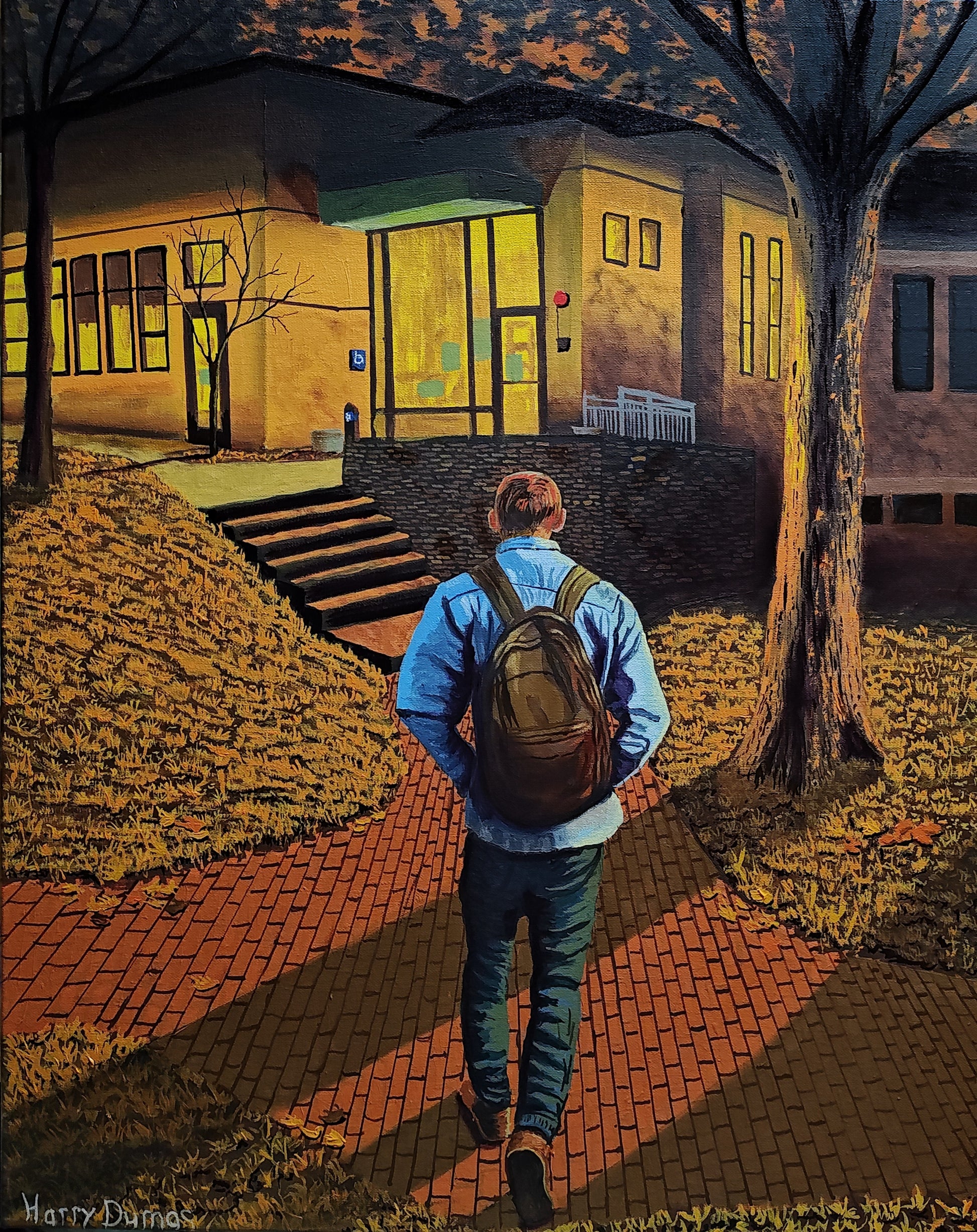 A lone young man walks toward the glow,